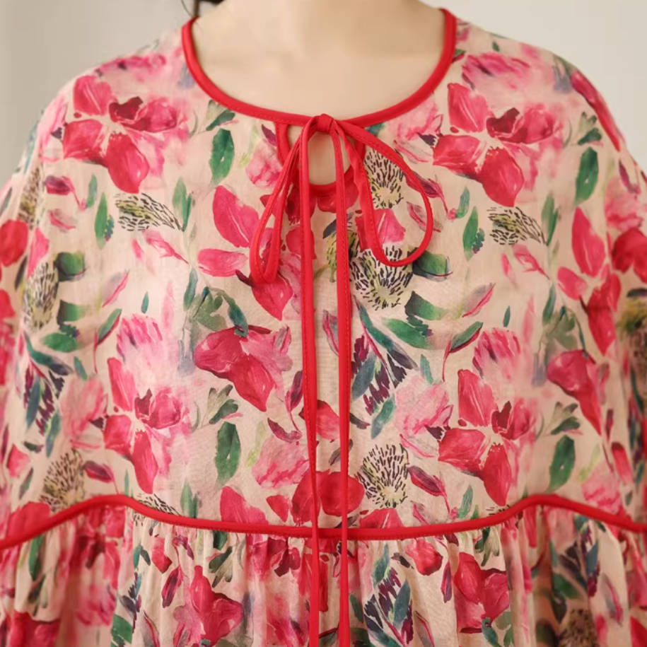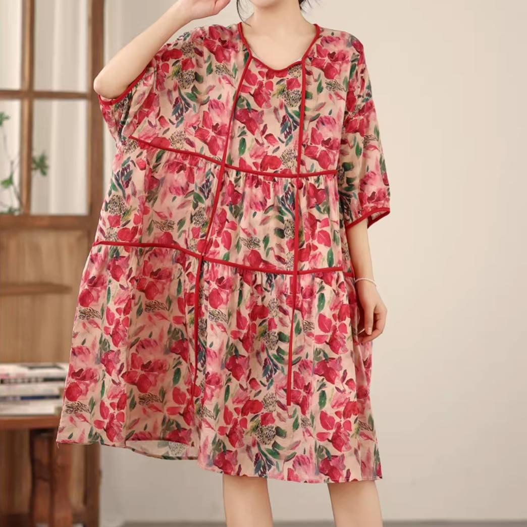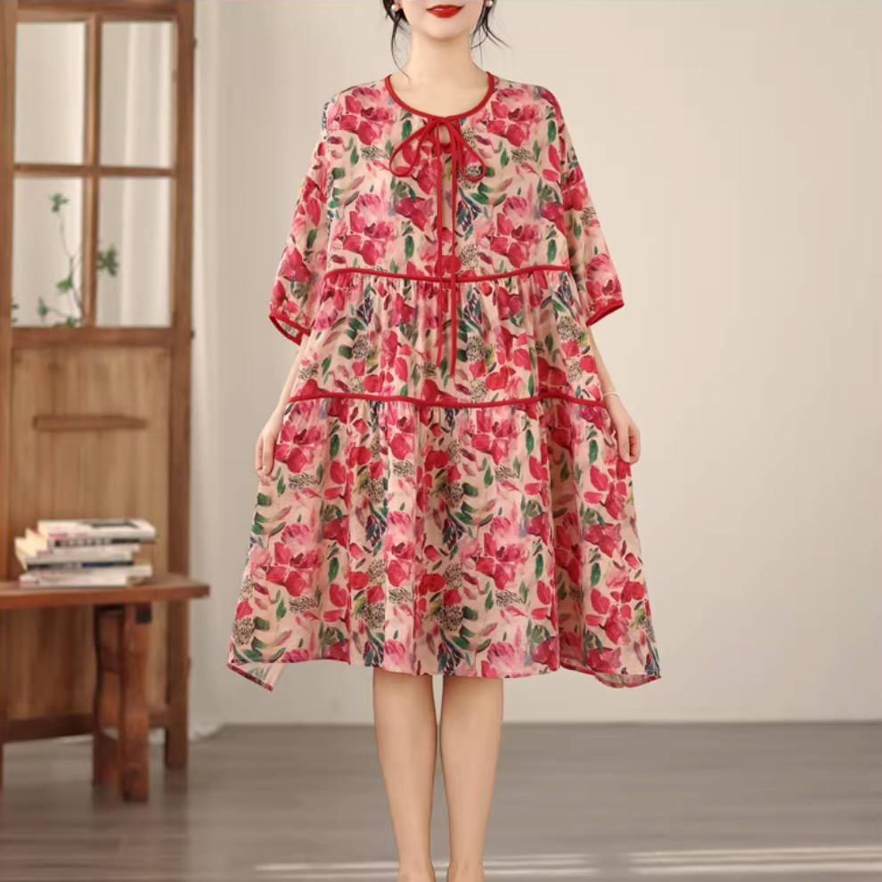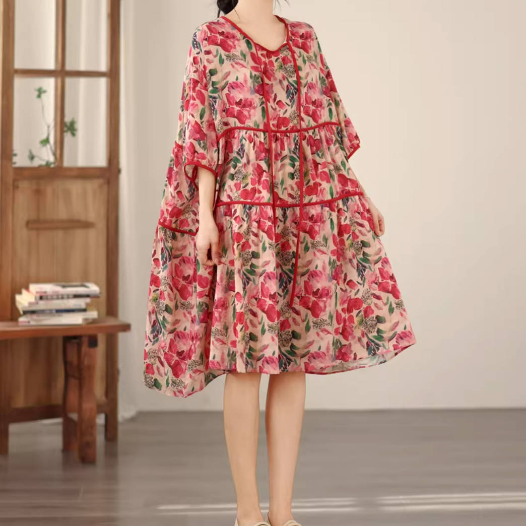 - Item: Summer Retro Linen Floral Printed Loose Half Sleeves A-Line Dress