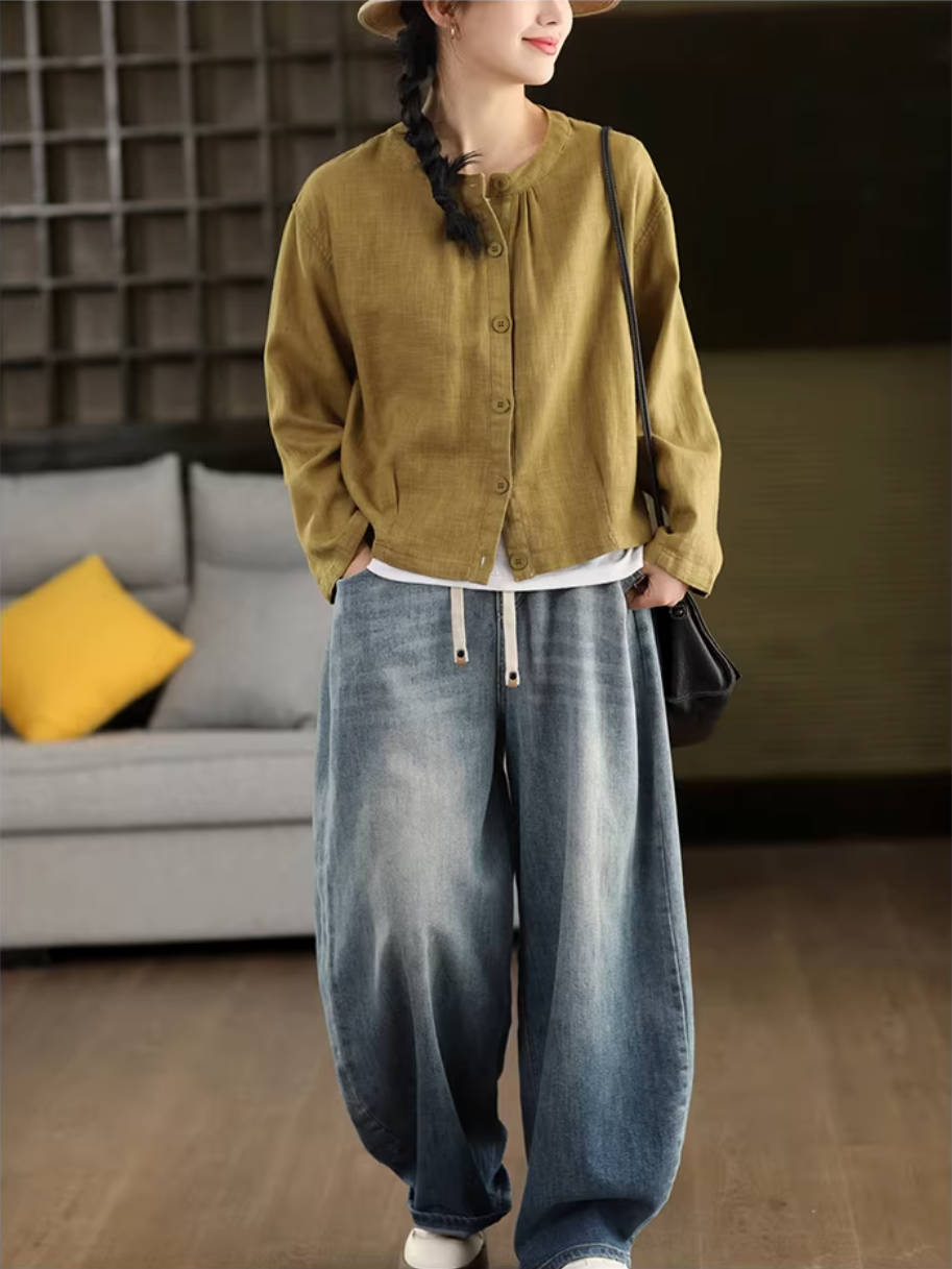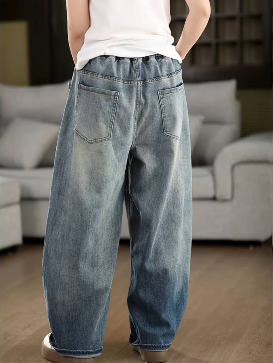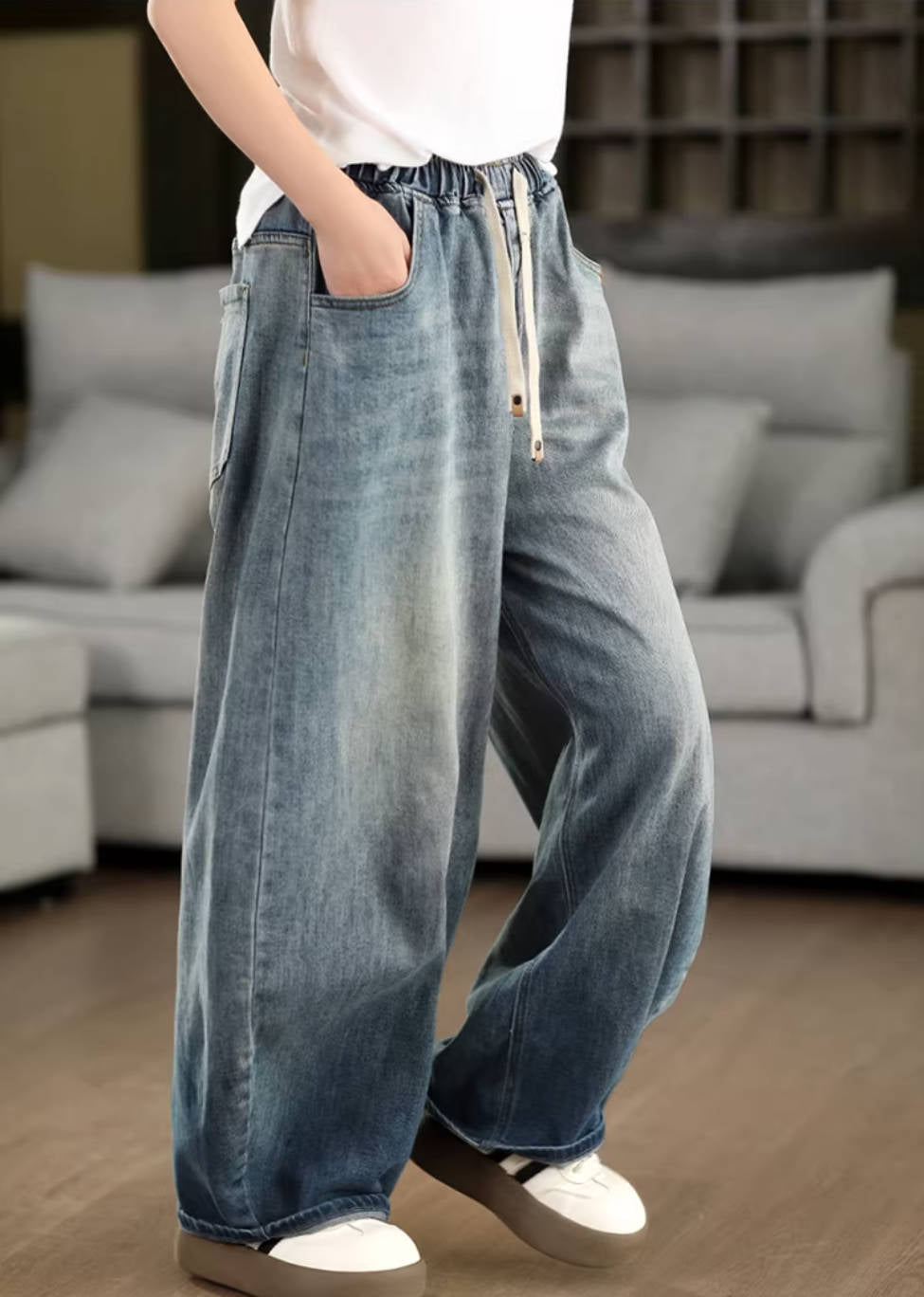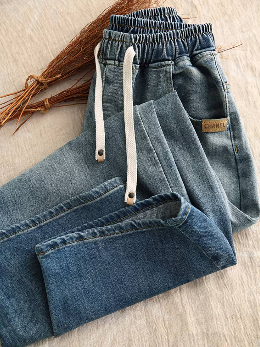 - Item: Spring Vintage Denim Classic Elastic Waist Loose Lace-Up Jeans