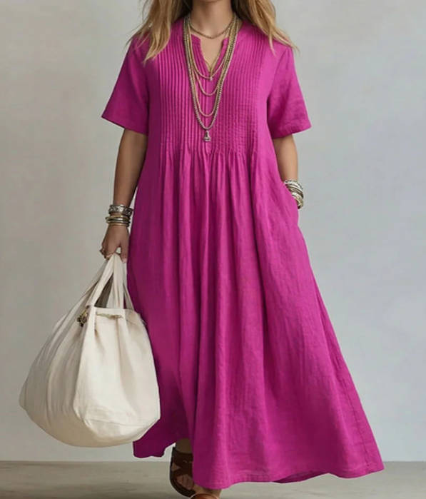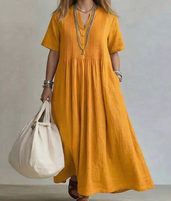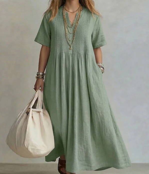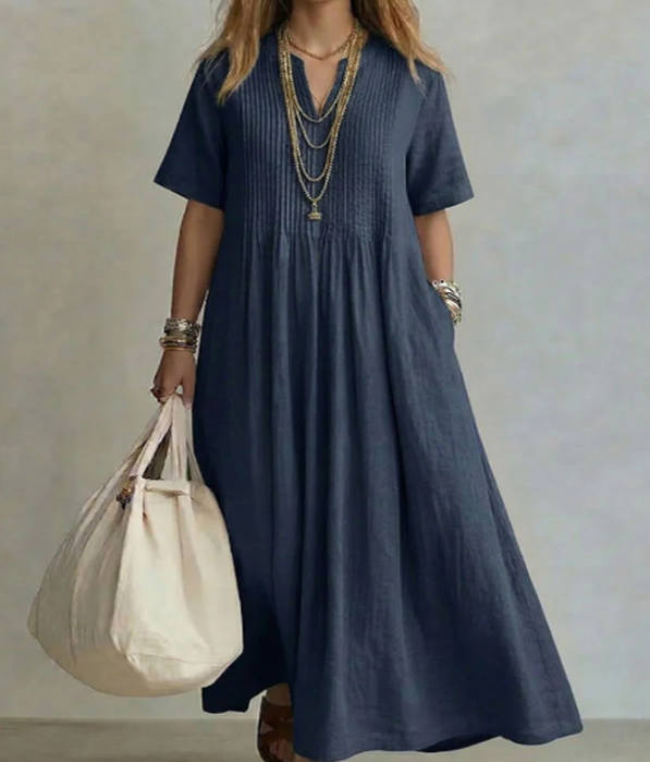 Casual Linen Loose Stripe V-neck Short Sleeve With Pockets Dress