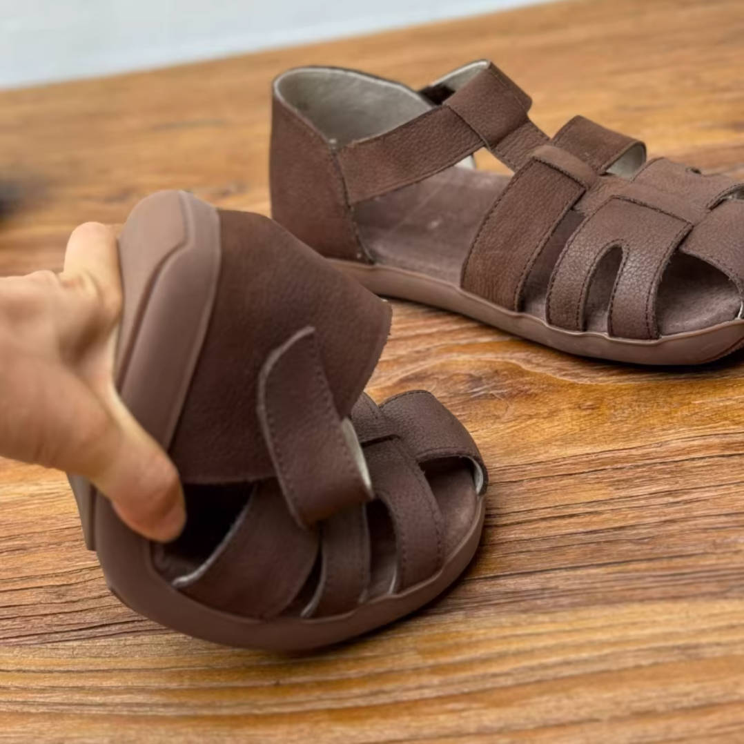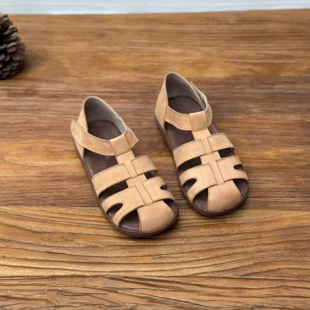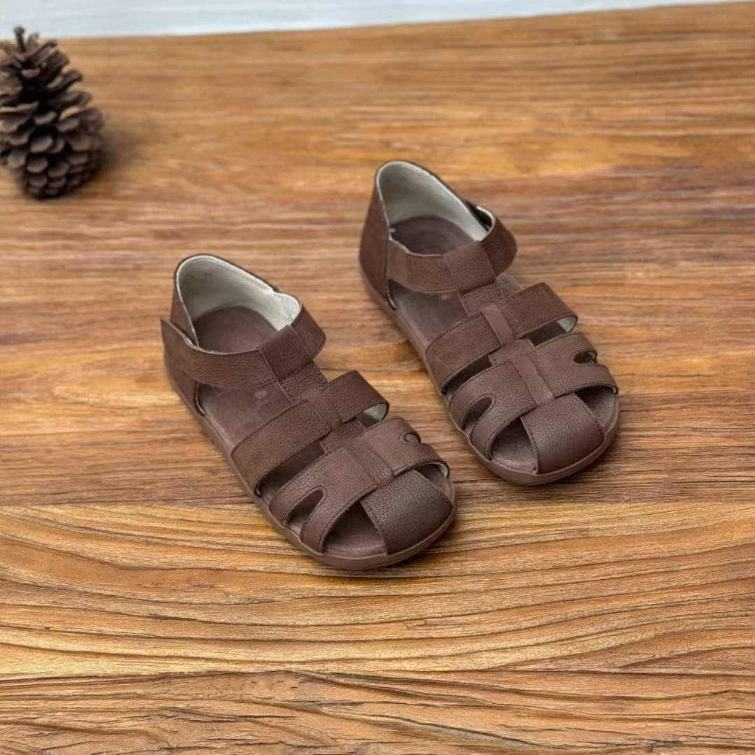 Retro Leather Open Toe Cut Out One Straped Velcro Soft Sole Flats