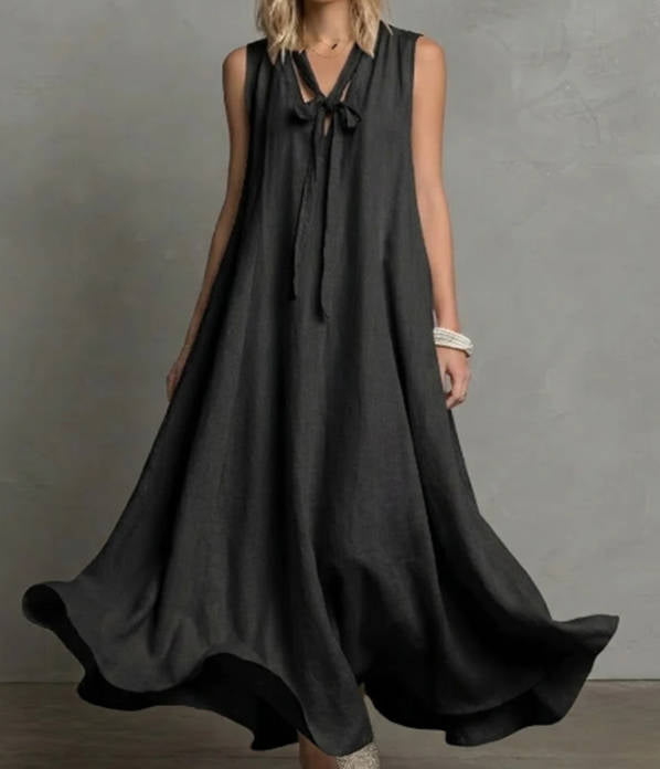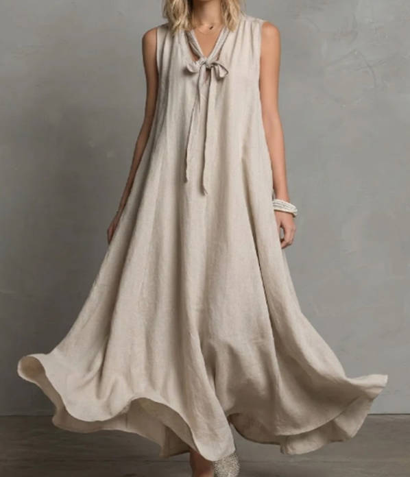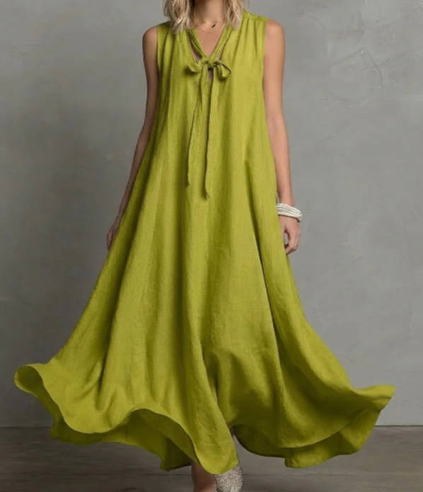 Spring Elegant Linen V-neck Tie Waist Sleeveless Dress