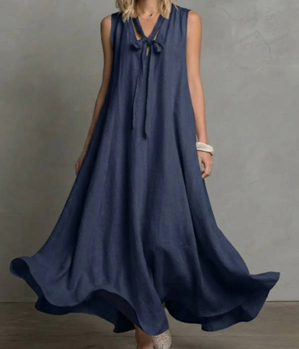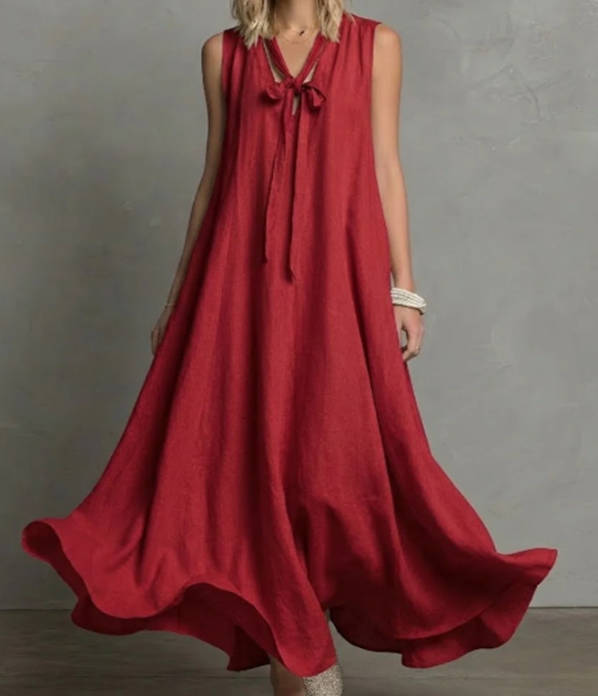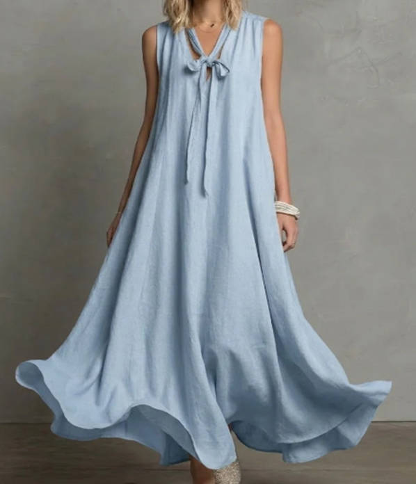 • Item: Spring Elegant Linen V-neck Tie Waist Sleeveless Dress
