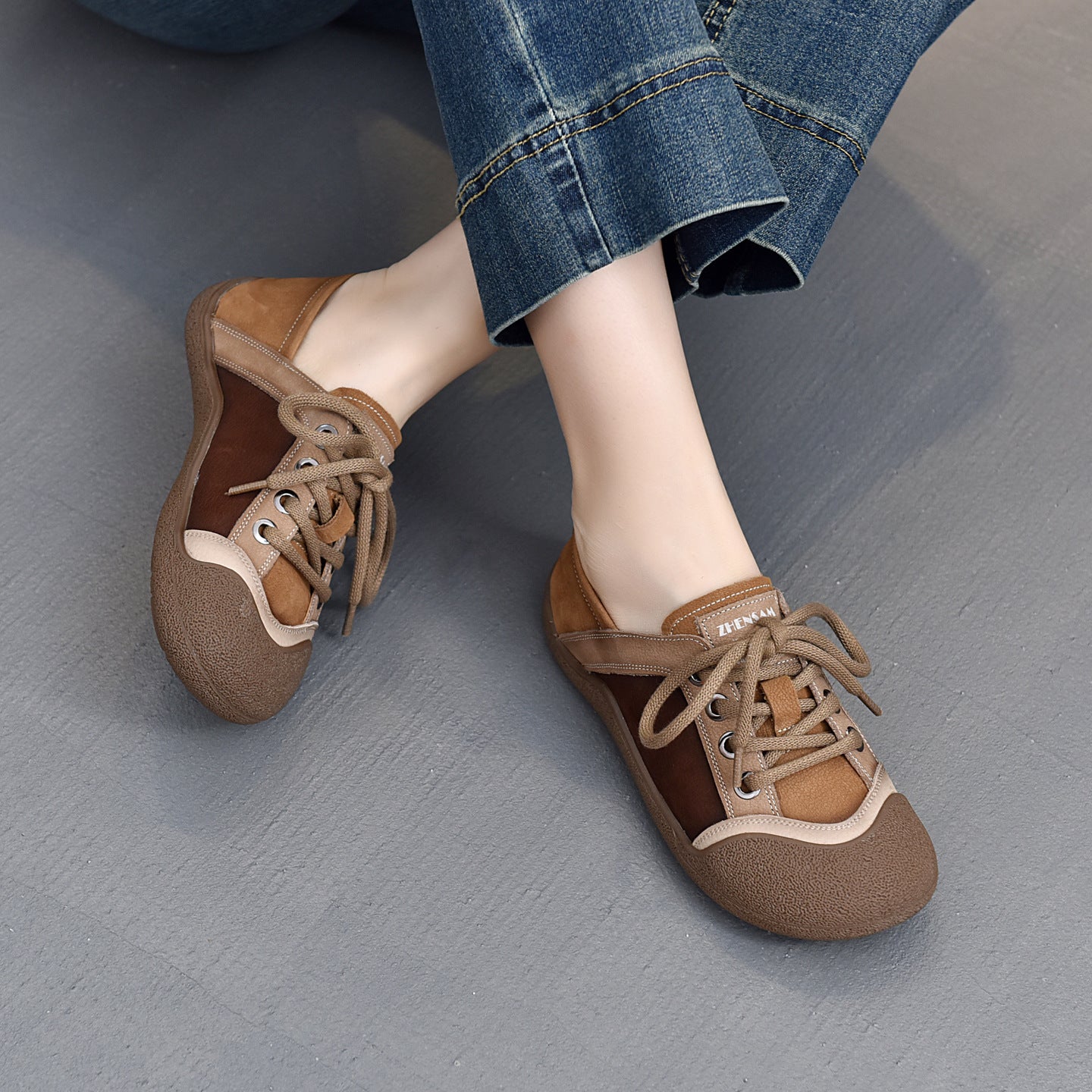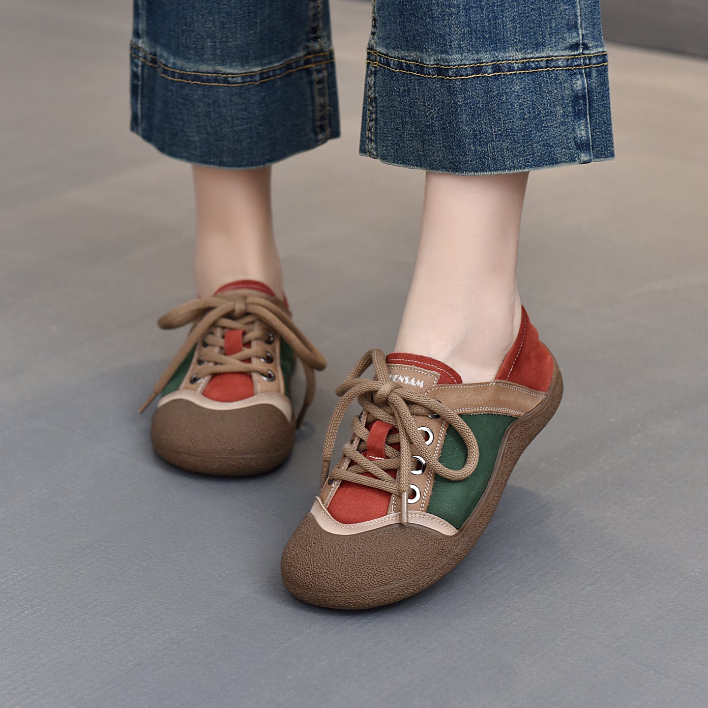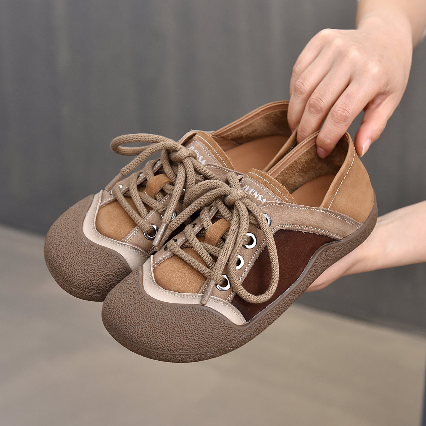 Casual Leather Round Toe Patchwork Lace-Up Soft Sole Flat Shoes