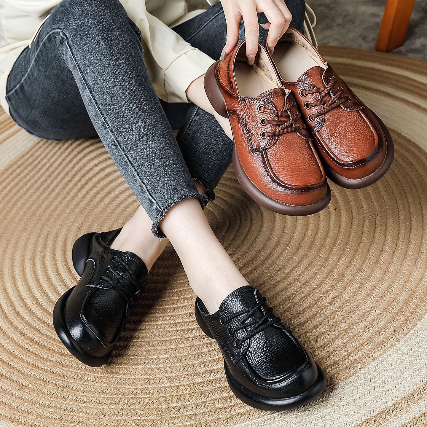 Spring Leather Retro Round Toe Soft Flat Sole Comfy Versatile Shoes