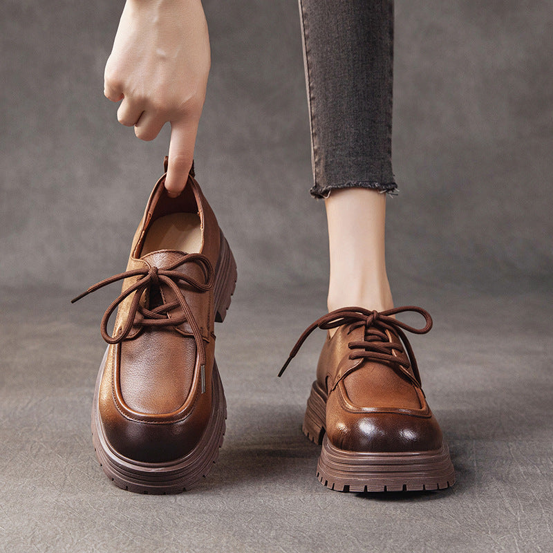 Spring Top Leather Round Toe Platform Thick Sole Lace-Up Casual Shoes