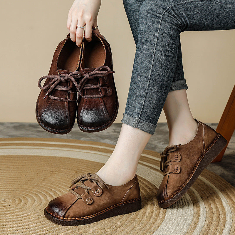 Top Leather Retro Gradient Color Round Toe Lace-Up Soft Sole Flats
