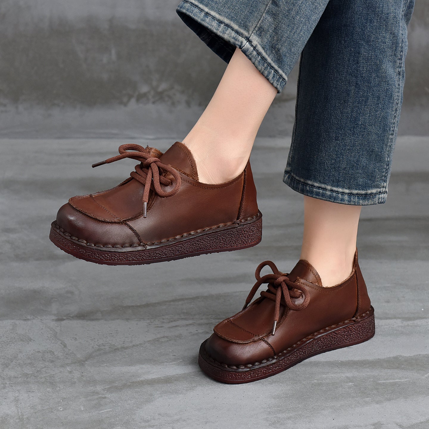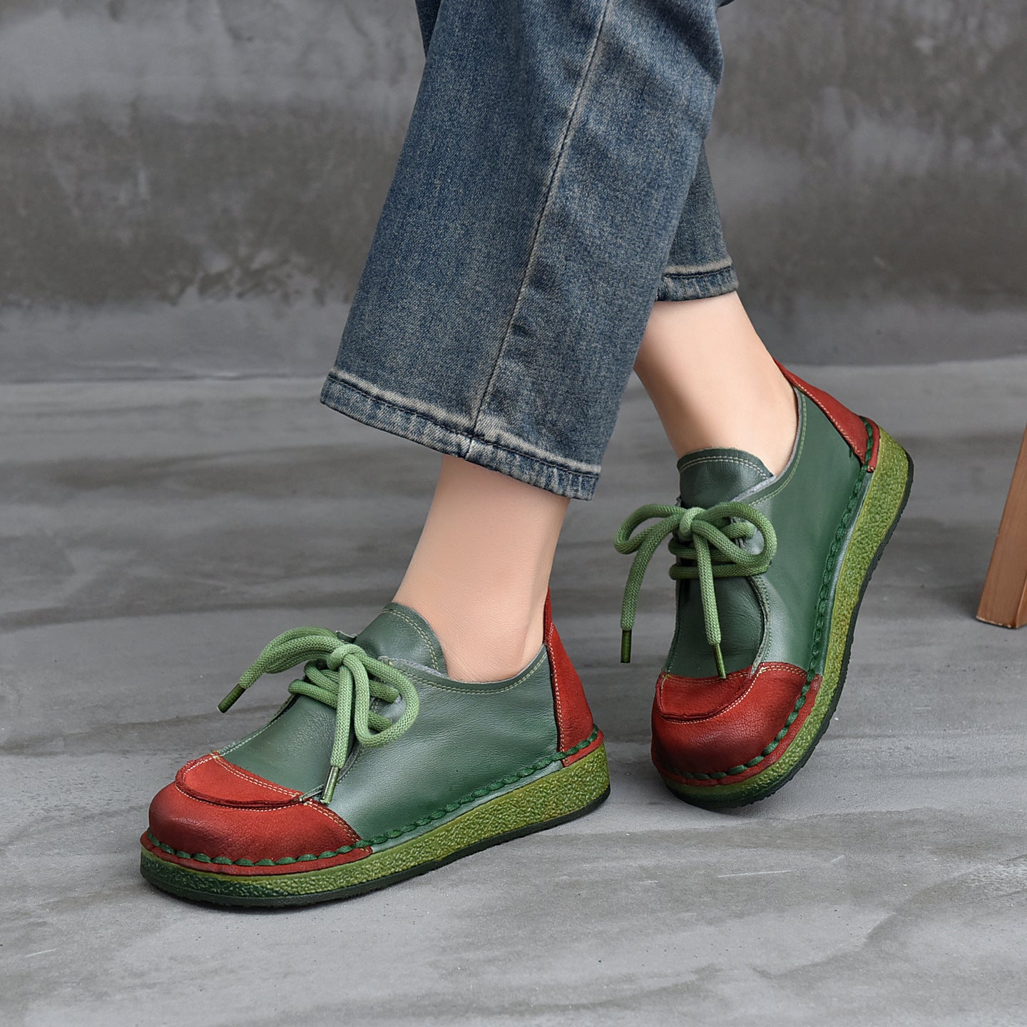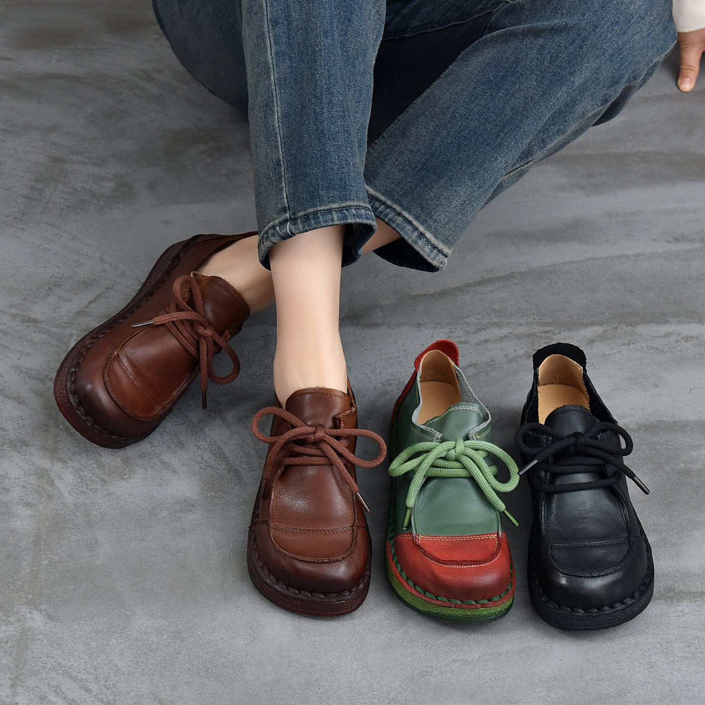 - Item Type: Retro Leather Wide Toe Lace-Up Patchwork Soft Sole Flat Shoes