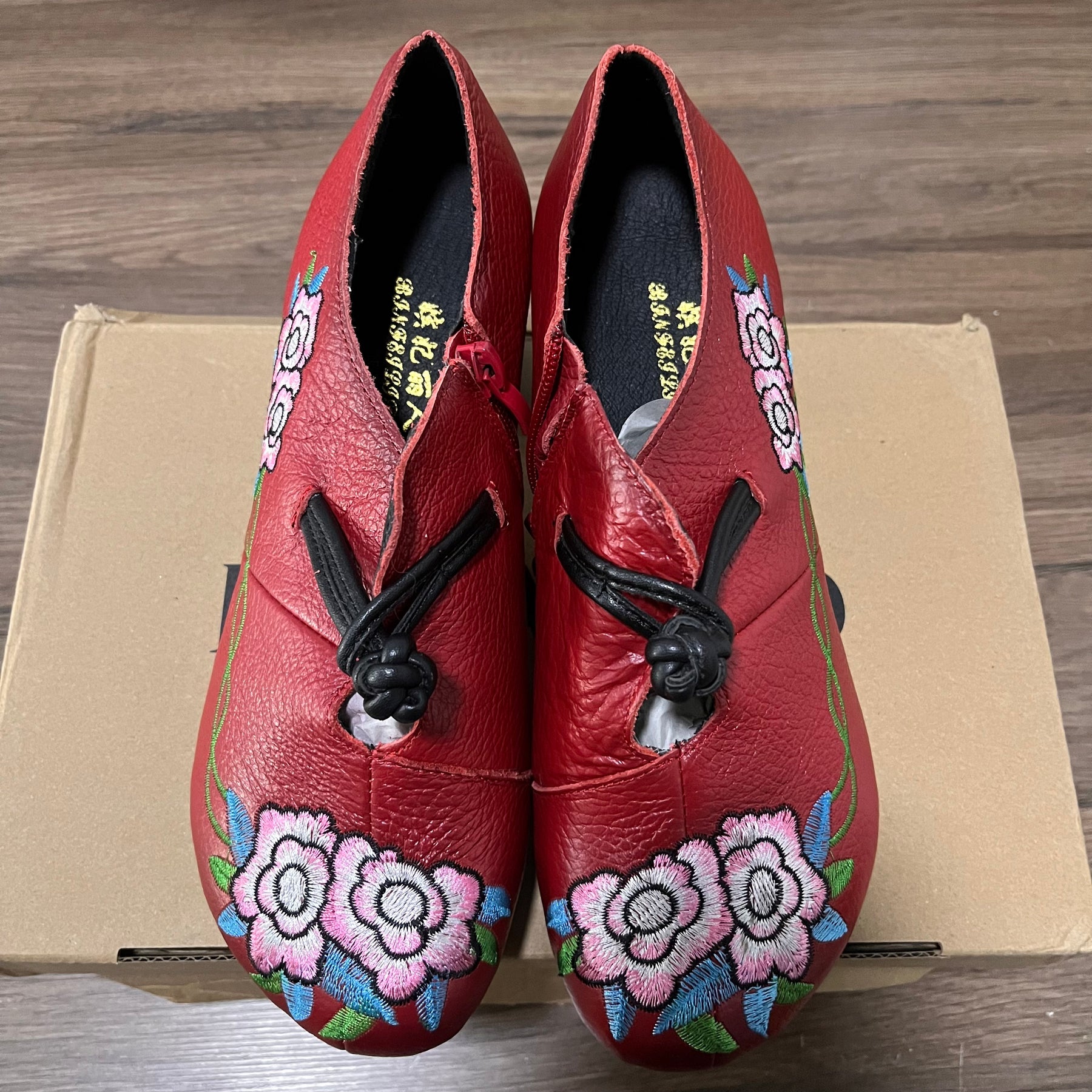 【Only 1】Red Retro Embroidered Leather Lace-Up Chunky Shoes