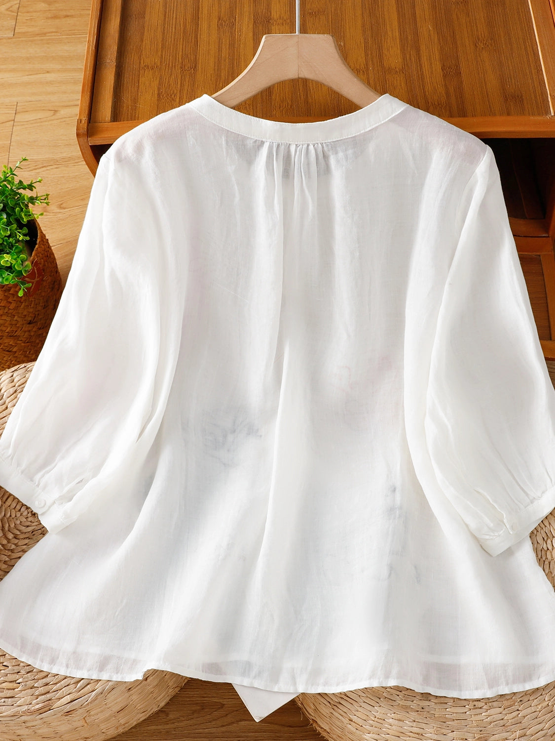 Retro Ramie Round Neck Casual Loose Thin Embroidered Shirt