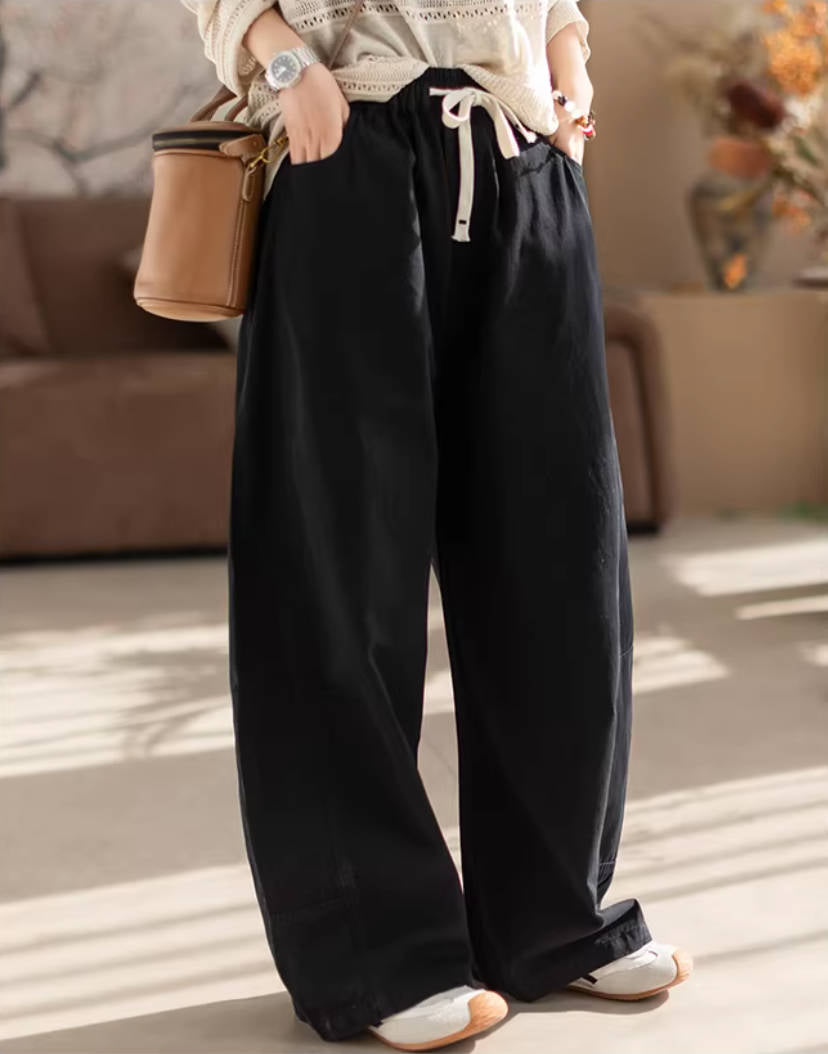 - Item: Casual Cotton Solid Color Elastic Waist Lace-Up Wide Leg Pants