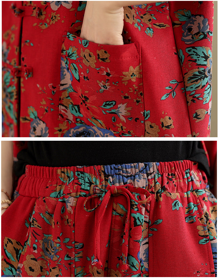 Pantalones casuales con forro polar de estilo étnico floral de invierno para mujer