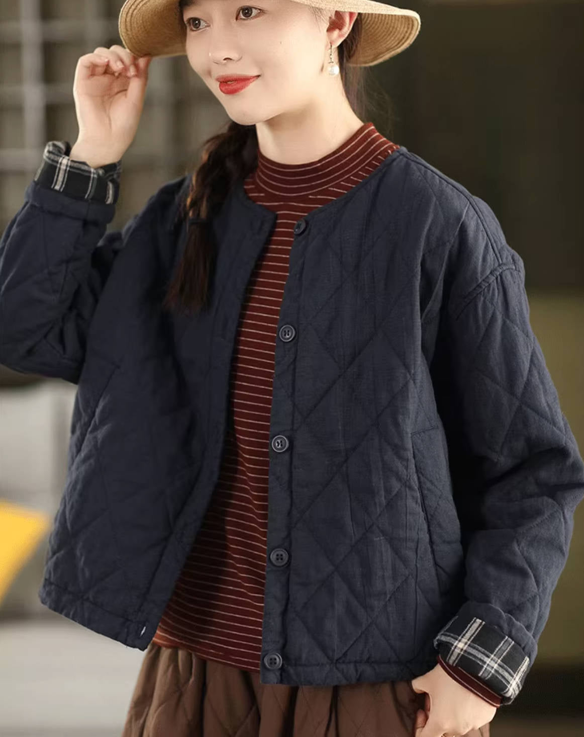 Abrigo de lino 100%, cuello redondo, botonadura sencilla, estampado de cuadros y forro polar.