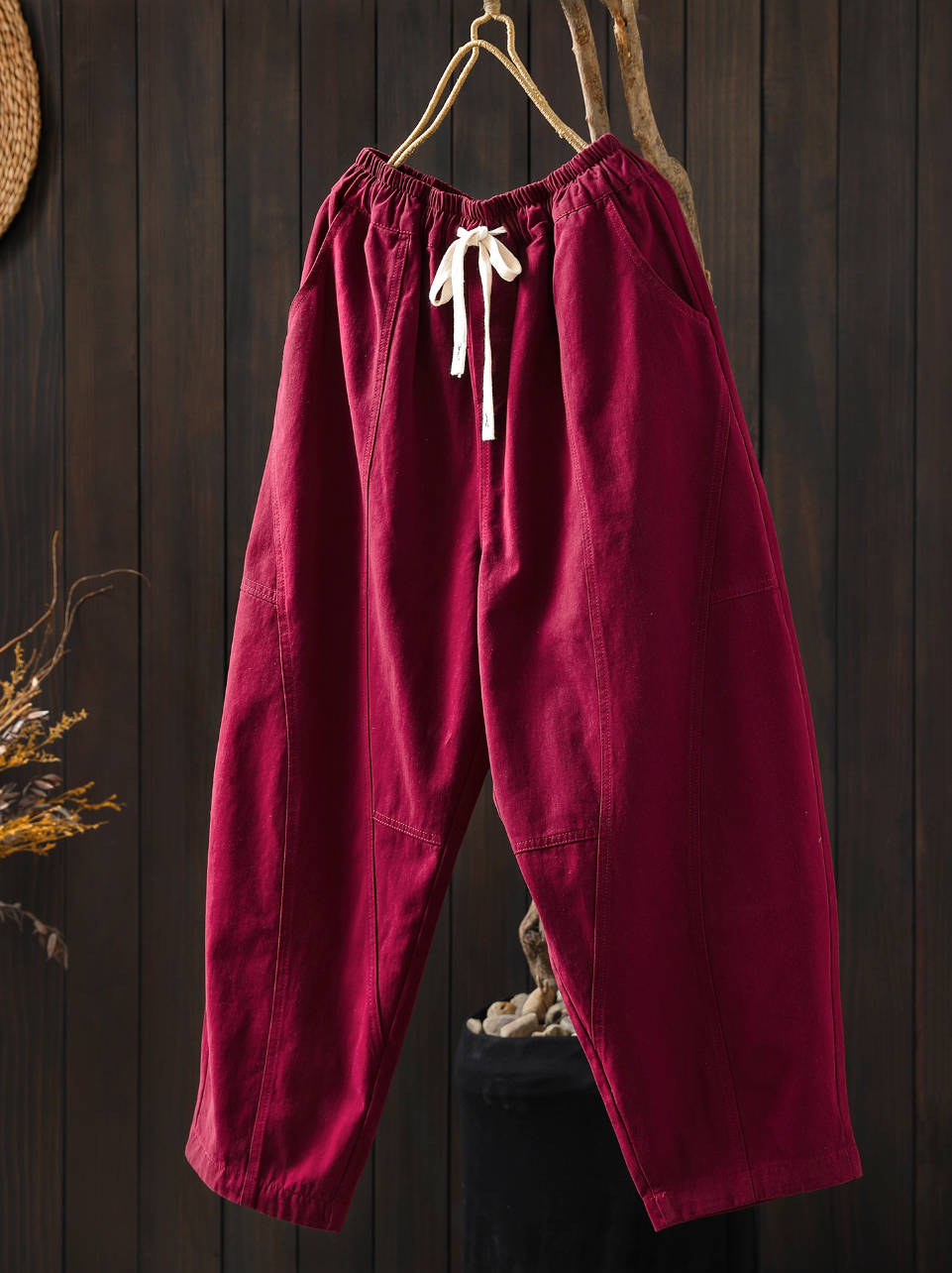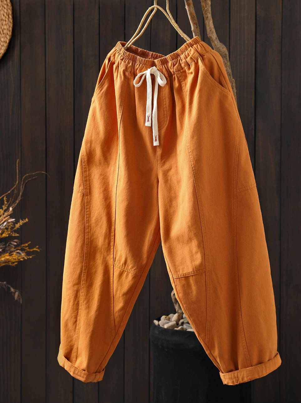 Pantalones casuales versátiles de cintura elástica sueltos de algodón de color sólido