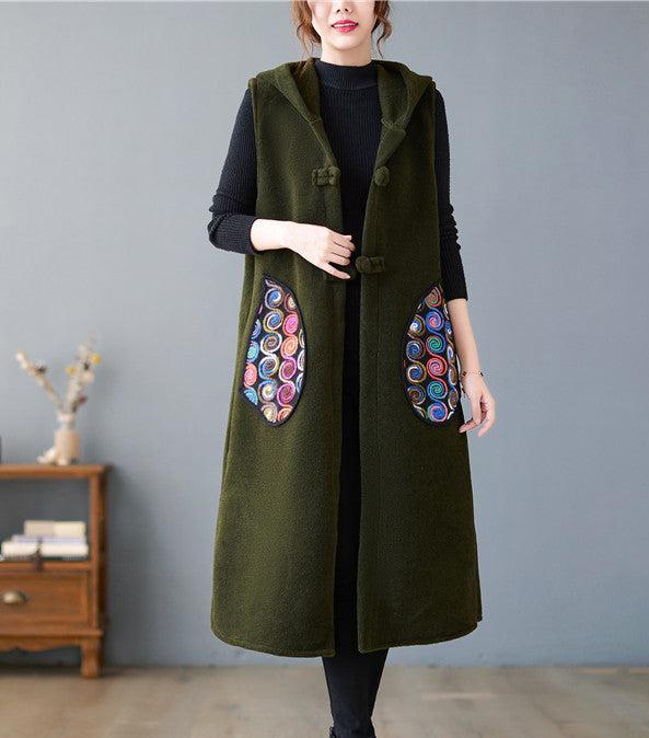 Chaqueta sin mangas de lana con capucha y largo medio, cálida, color verde militar