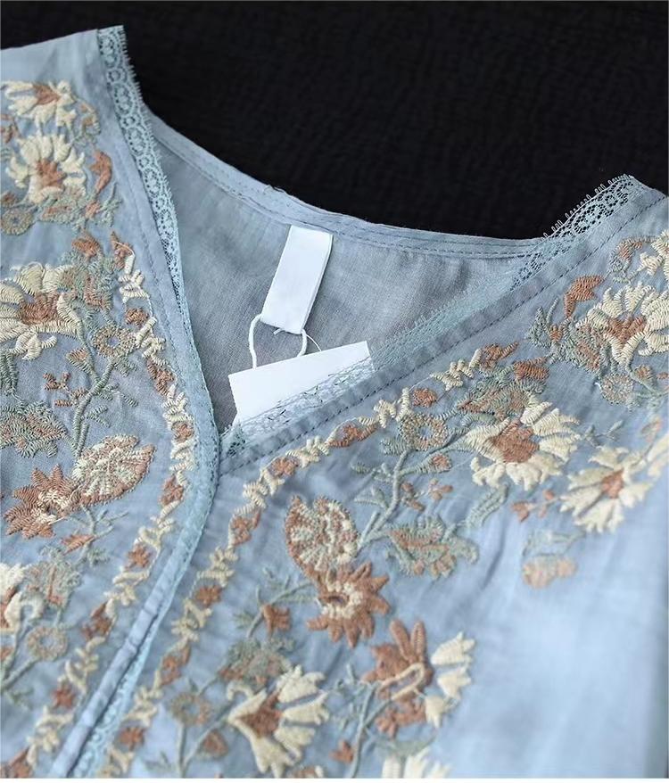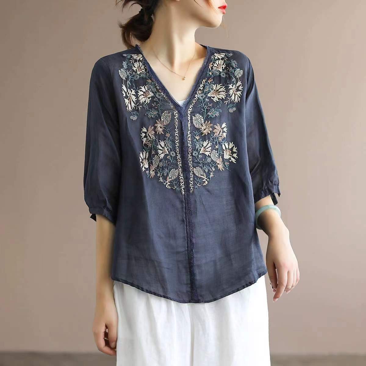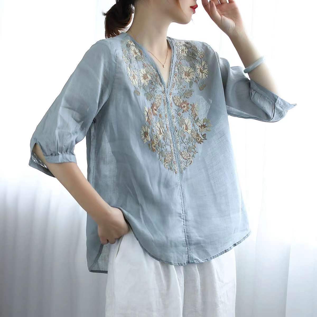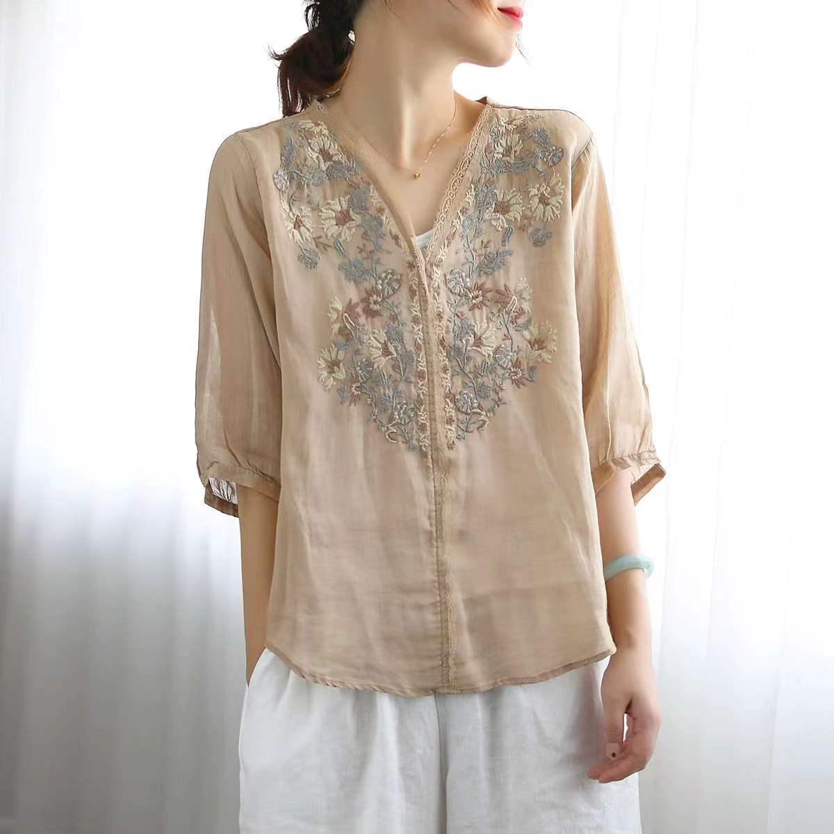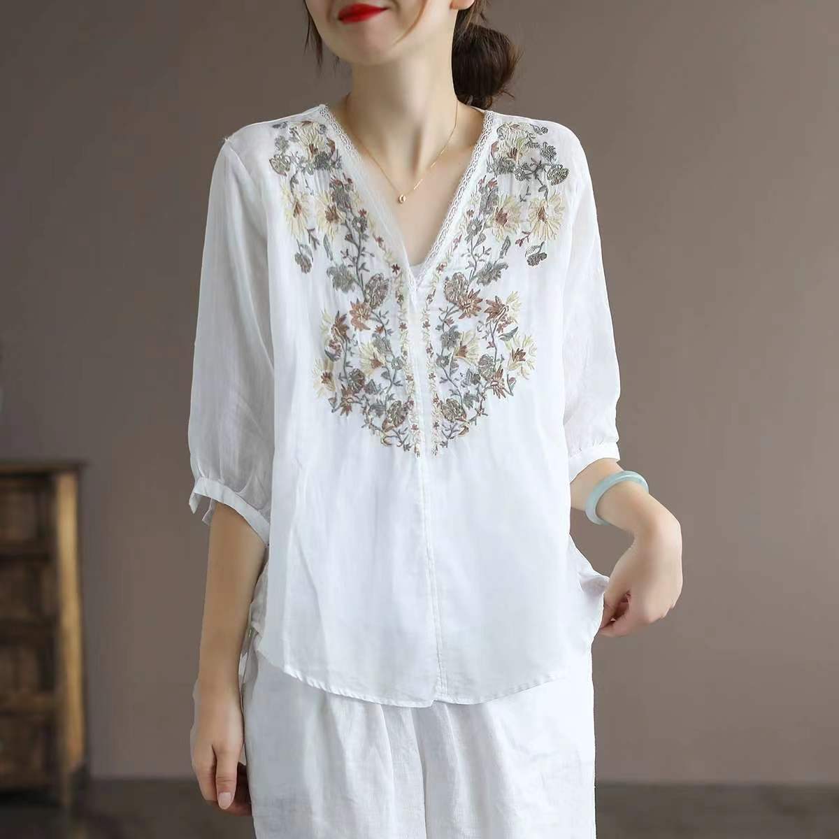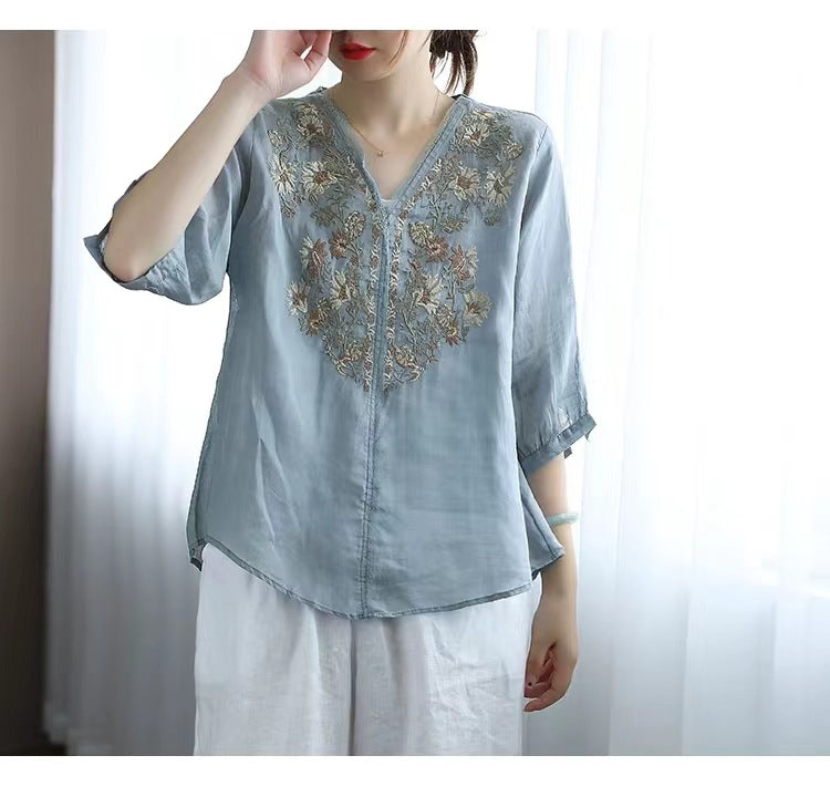 Blusa con cuello en V y bordado floral de manga corta de ramio de verano