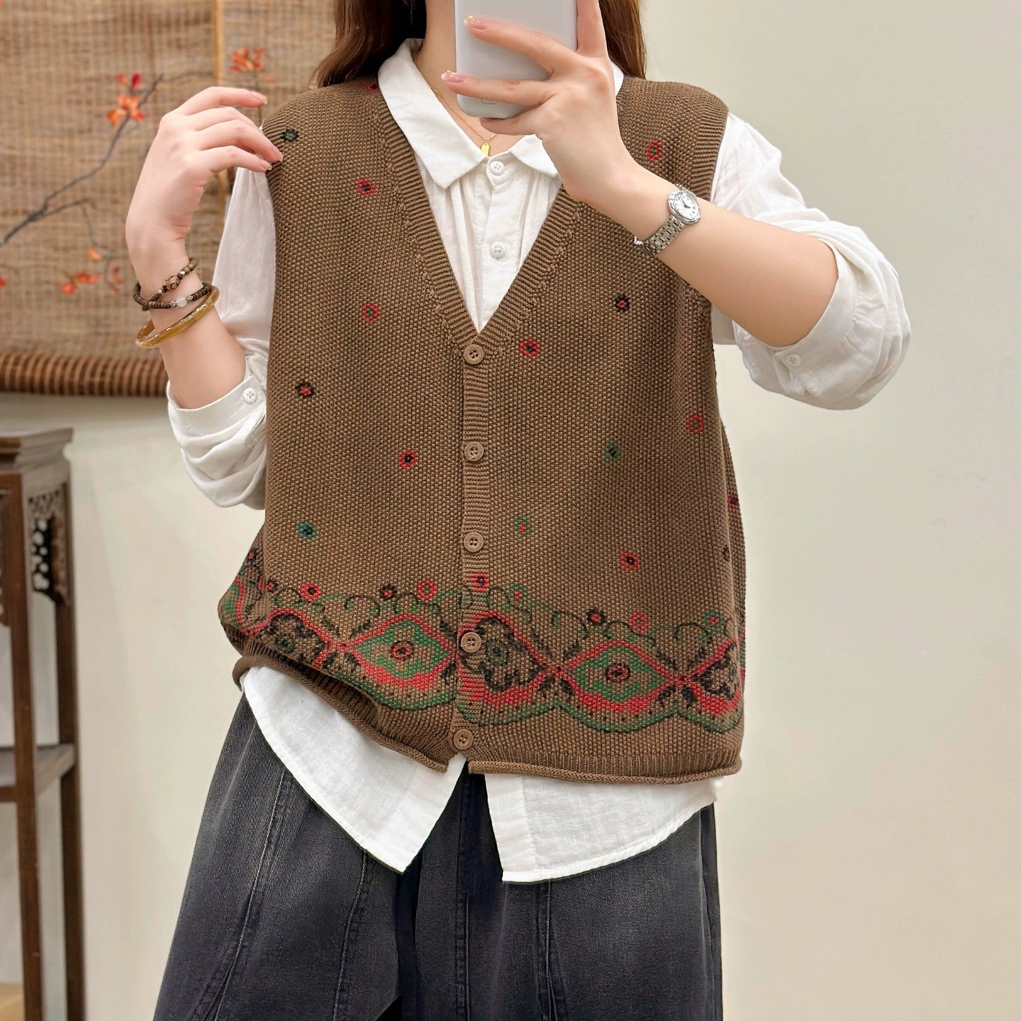 Women Autumn Cotton V-Neck Embroidered Loose Cardigans