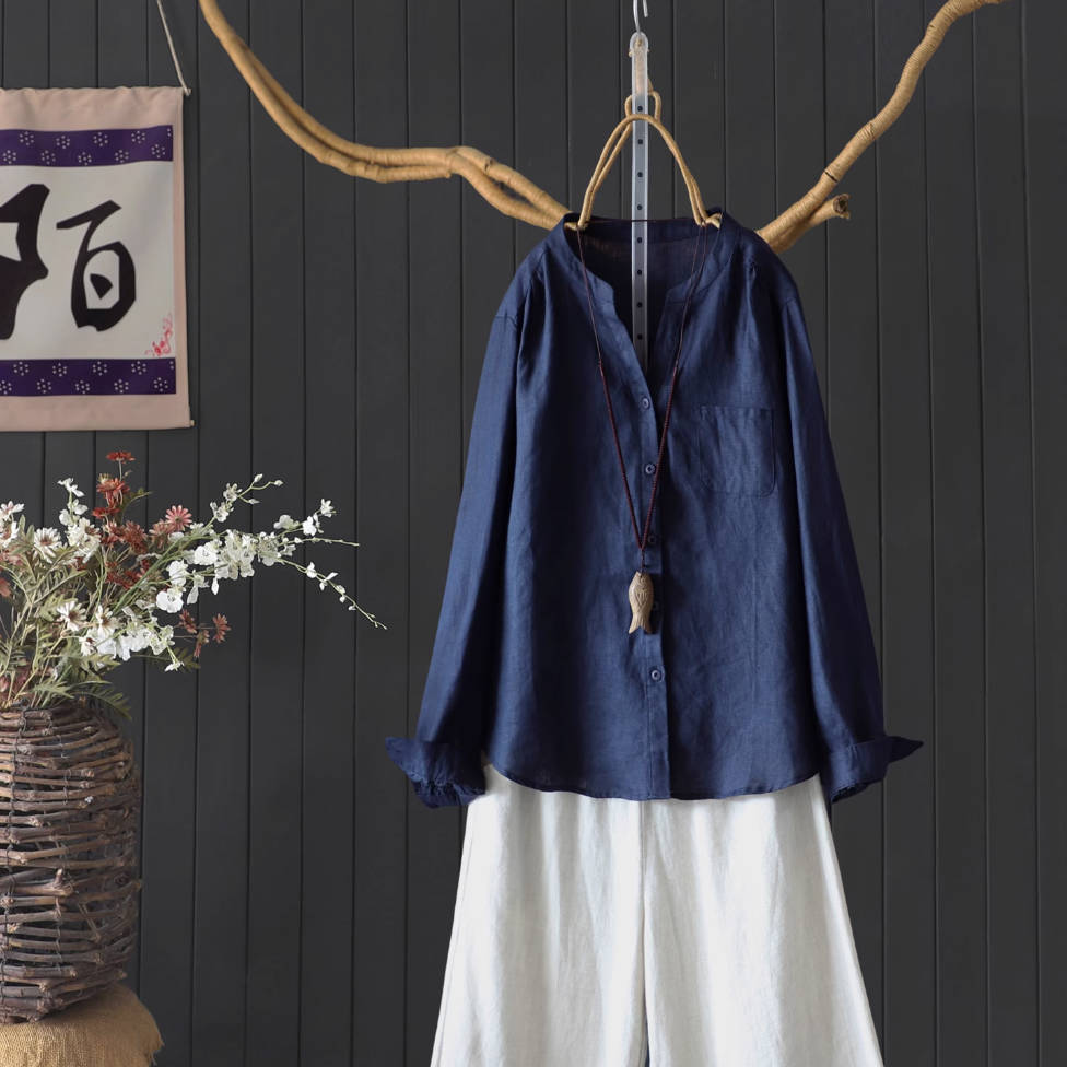 - Article : Chemise d'automne en lin à col en V et manches longues à simple boutonnage