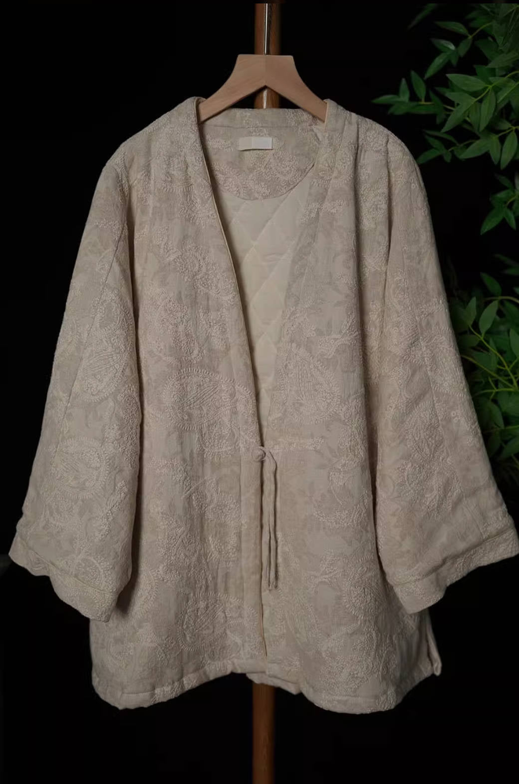 - Article : Manteau long d'hiver épais et chaud en lin jacquard à col en V et doublure en coton
