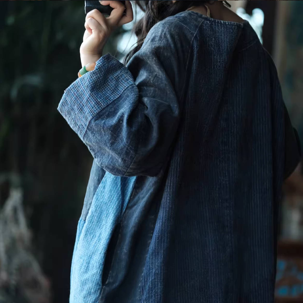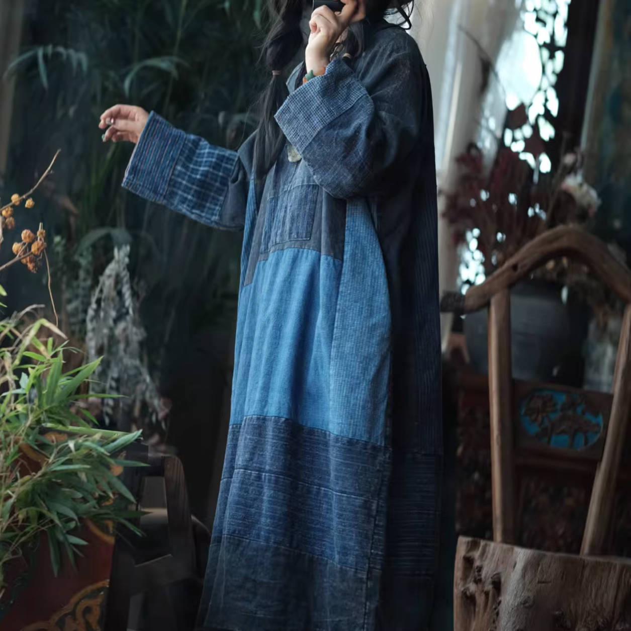 - Article : Robe printanière rétro en patchwork de coton à col rond et manches longues