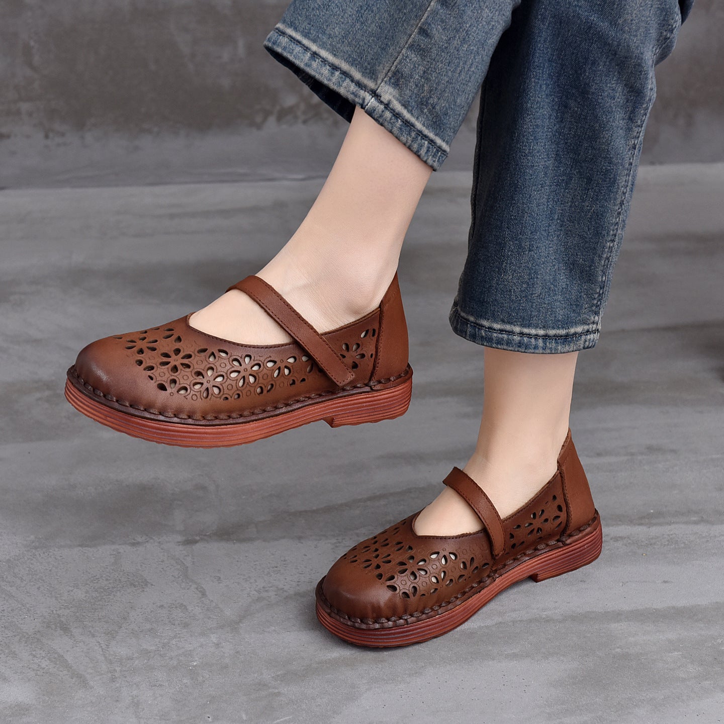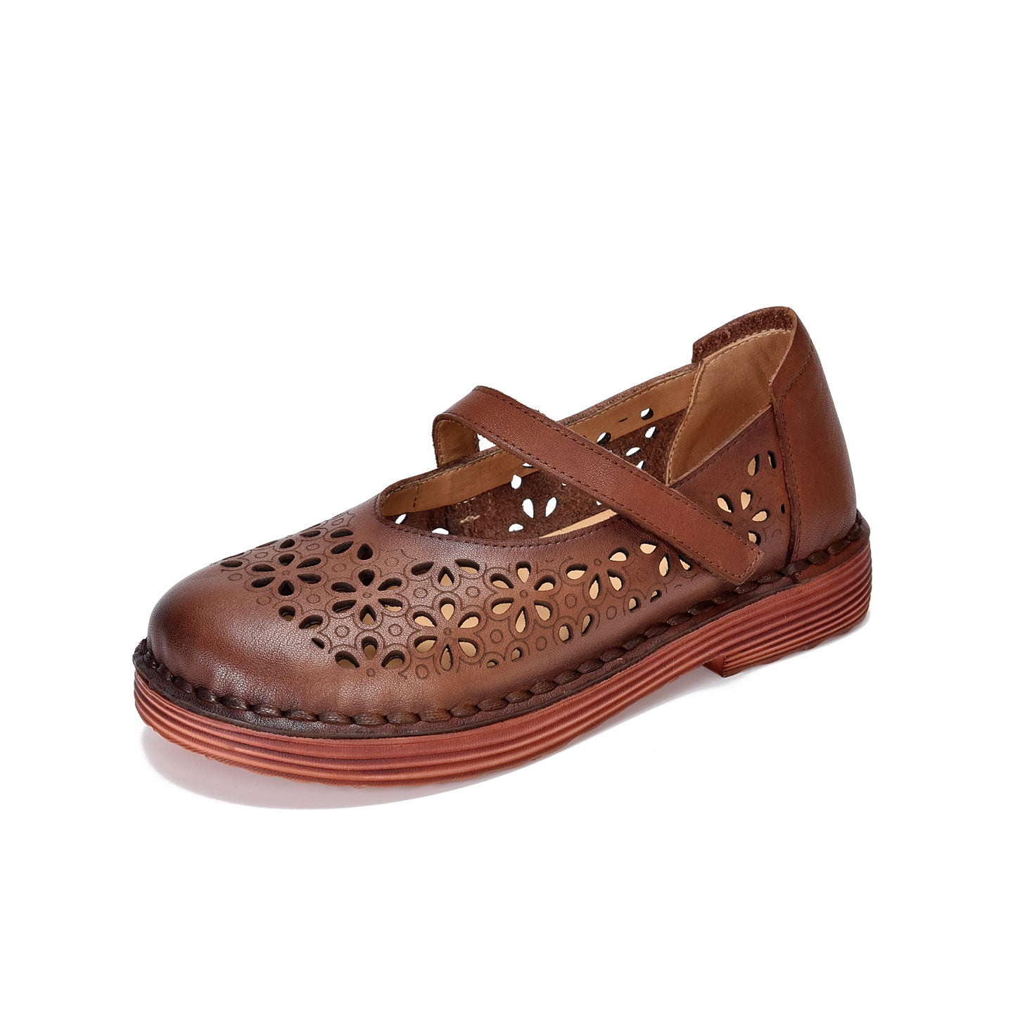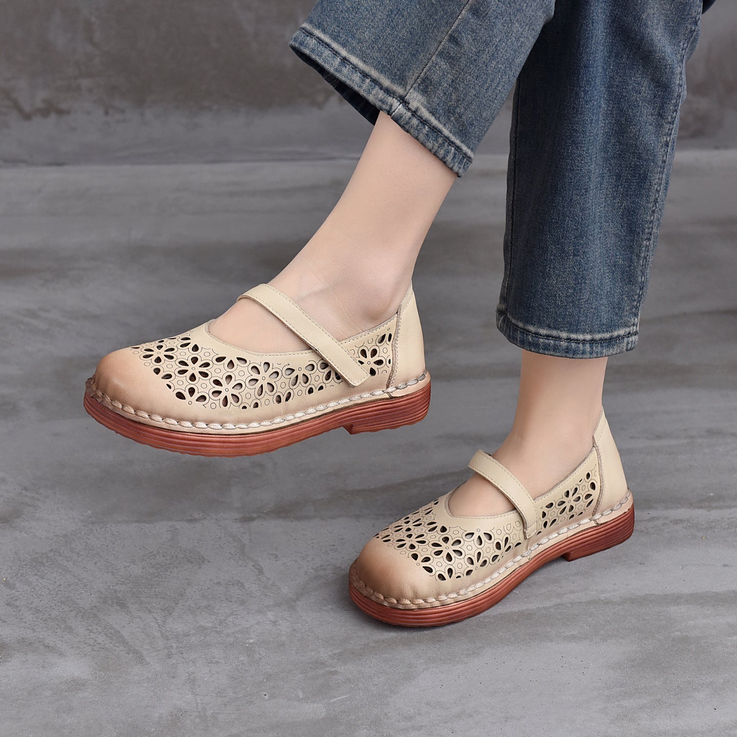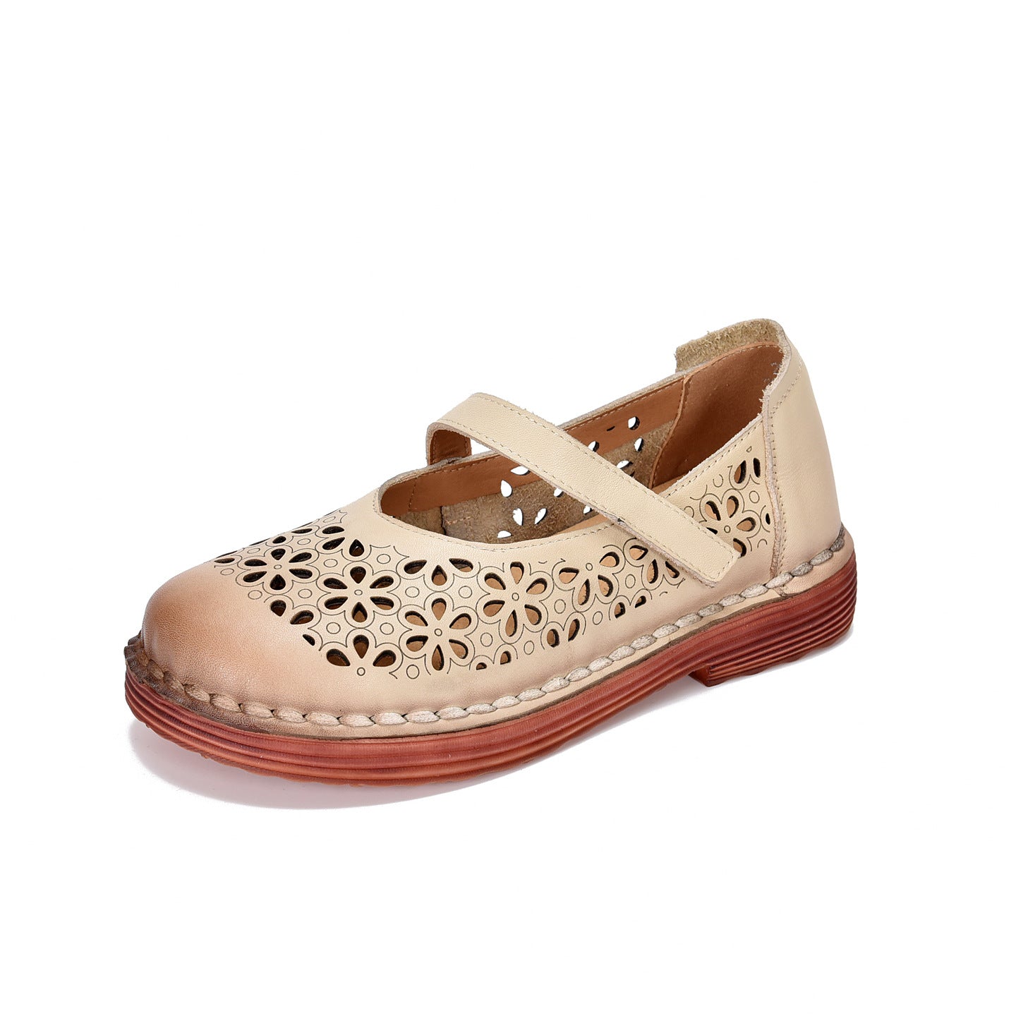 Genuine Leather Round Toe Hallow One Straped Velcro Flat Shoes