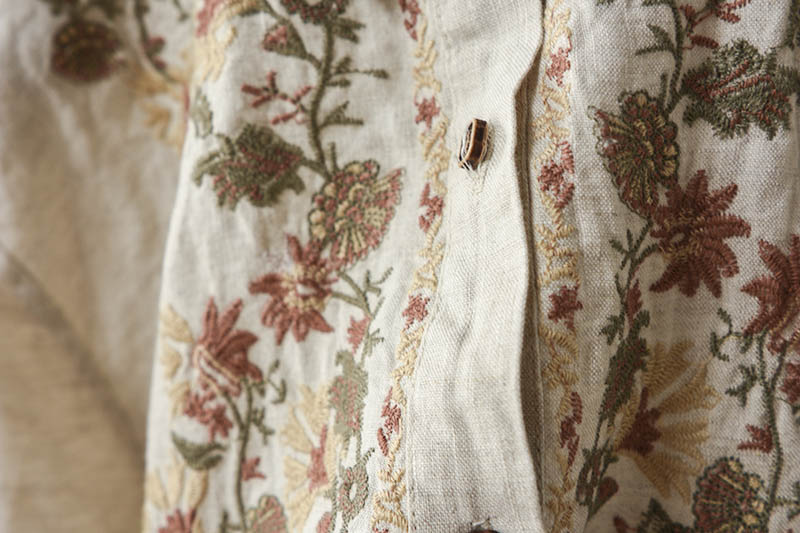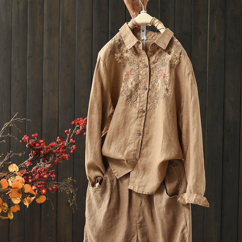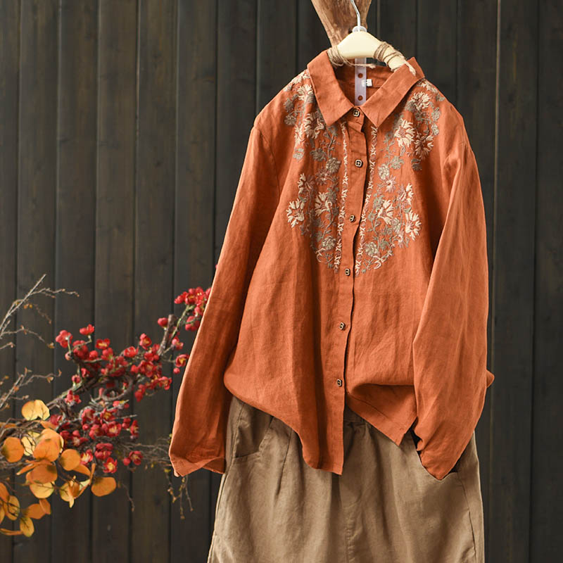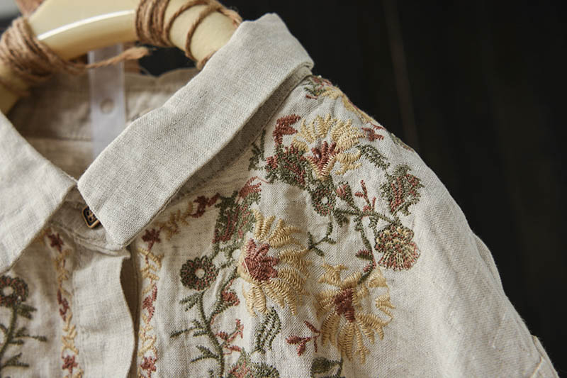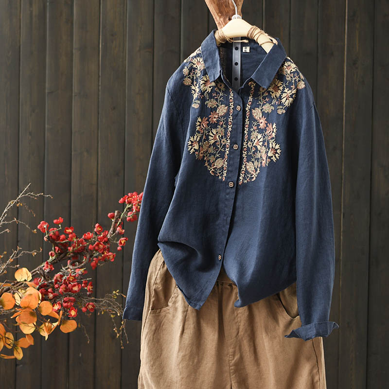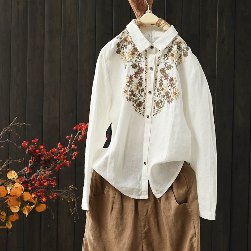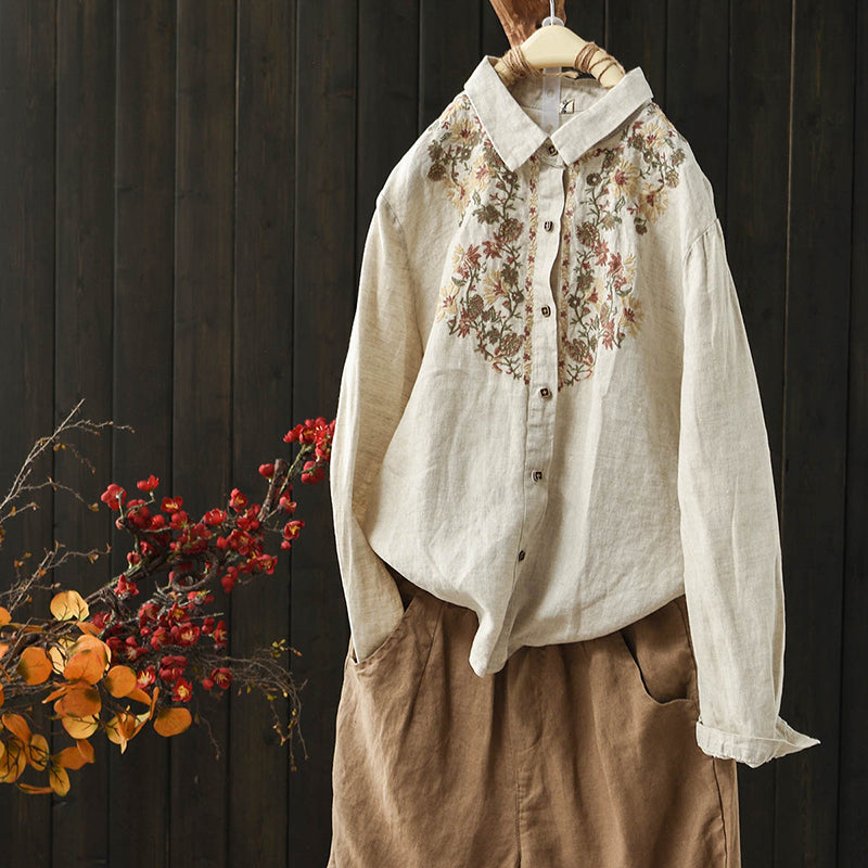 Chemise décontractée en lin à fleurs brodées vintage pour femme