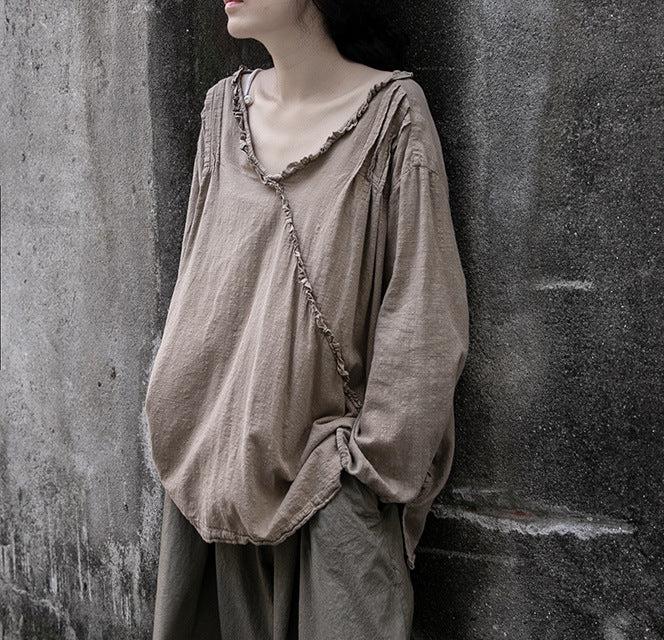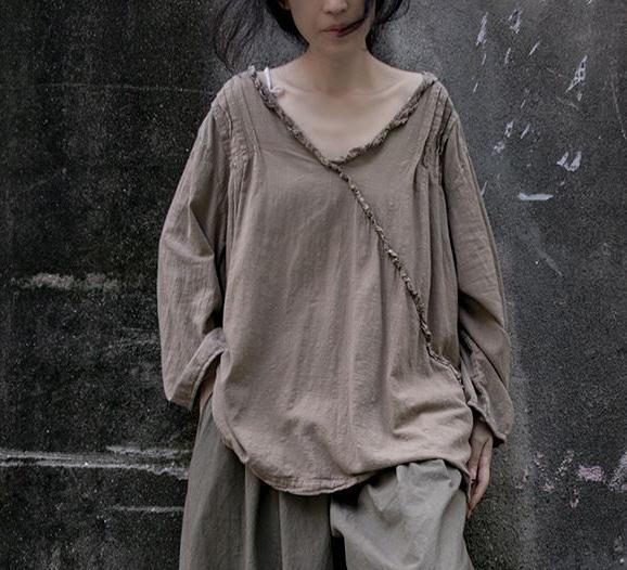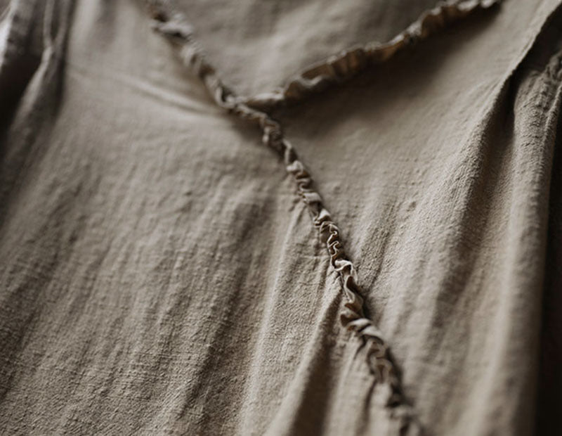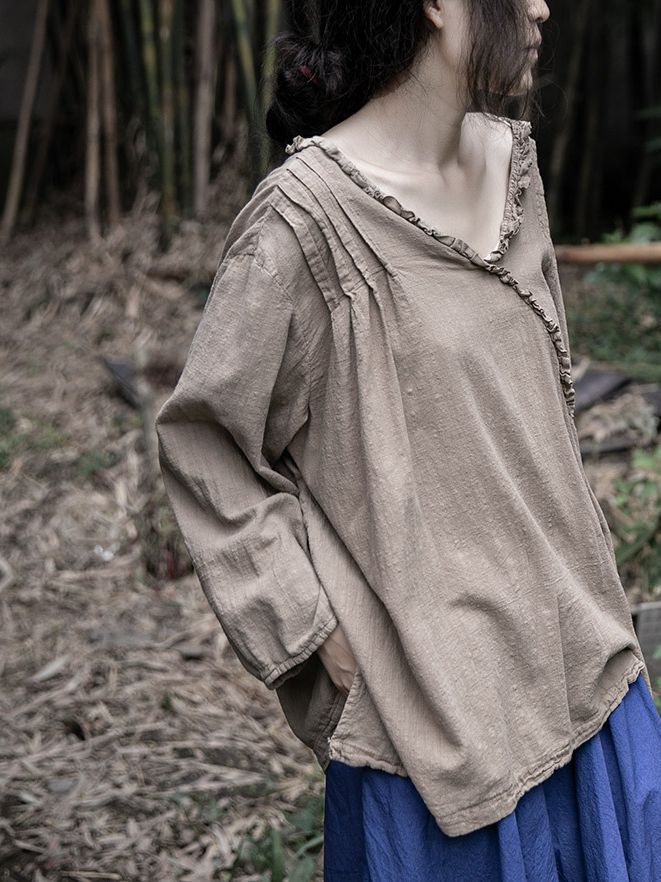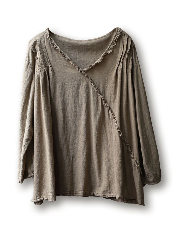 - Item£ºSolid Color Ruffled V- Neck Cotton Linen T- Shirts