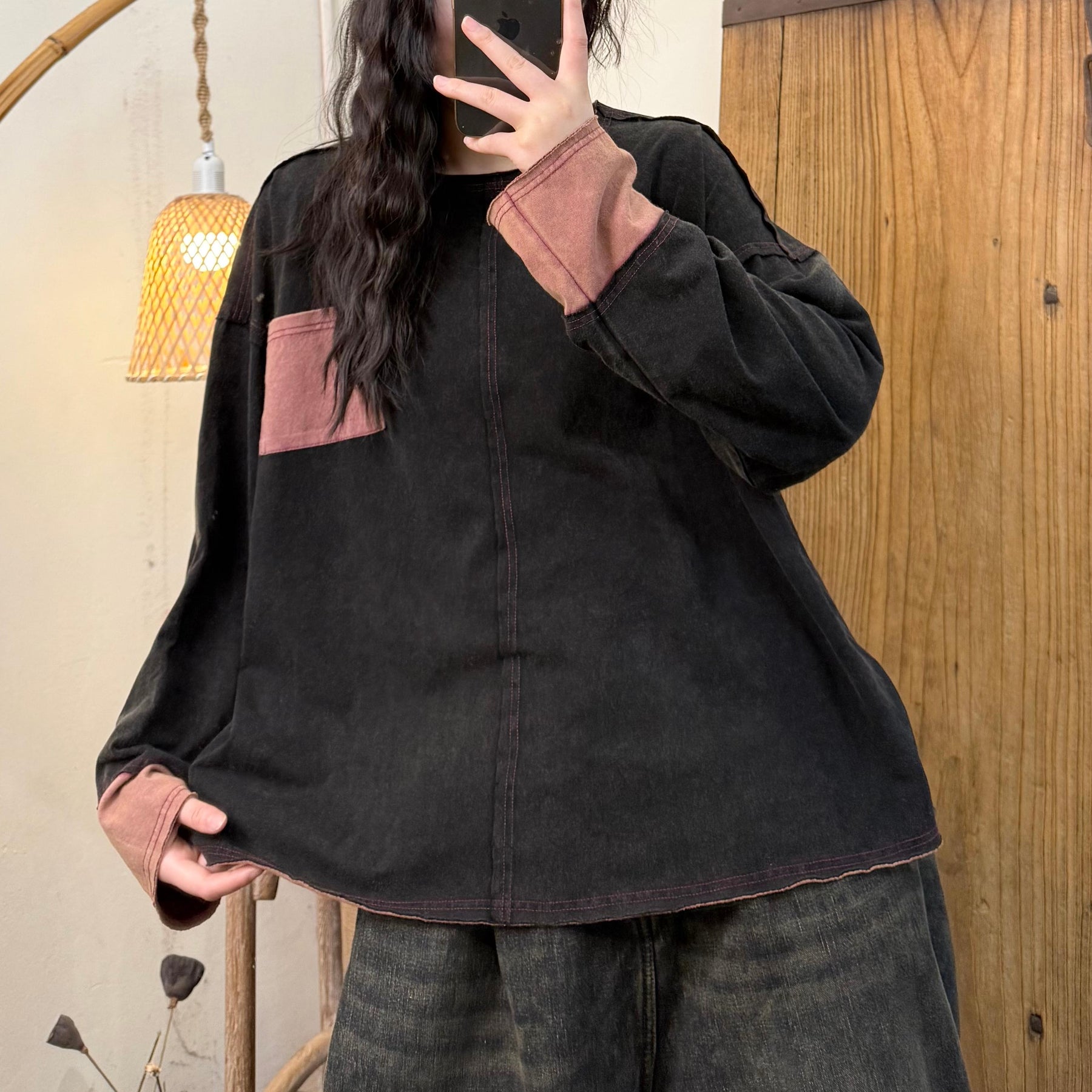 Women Spring Casual Vintage Knit Cotton Patchwork Top